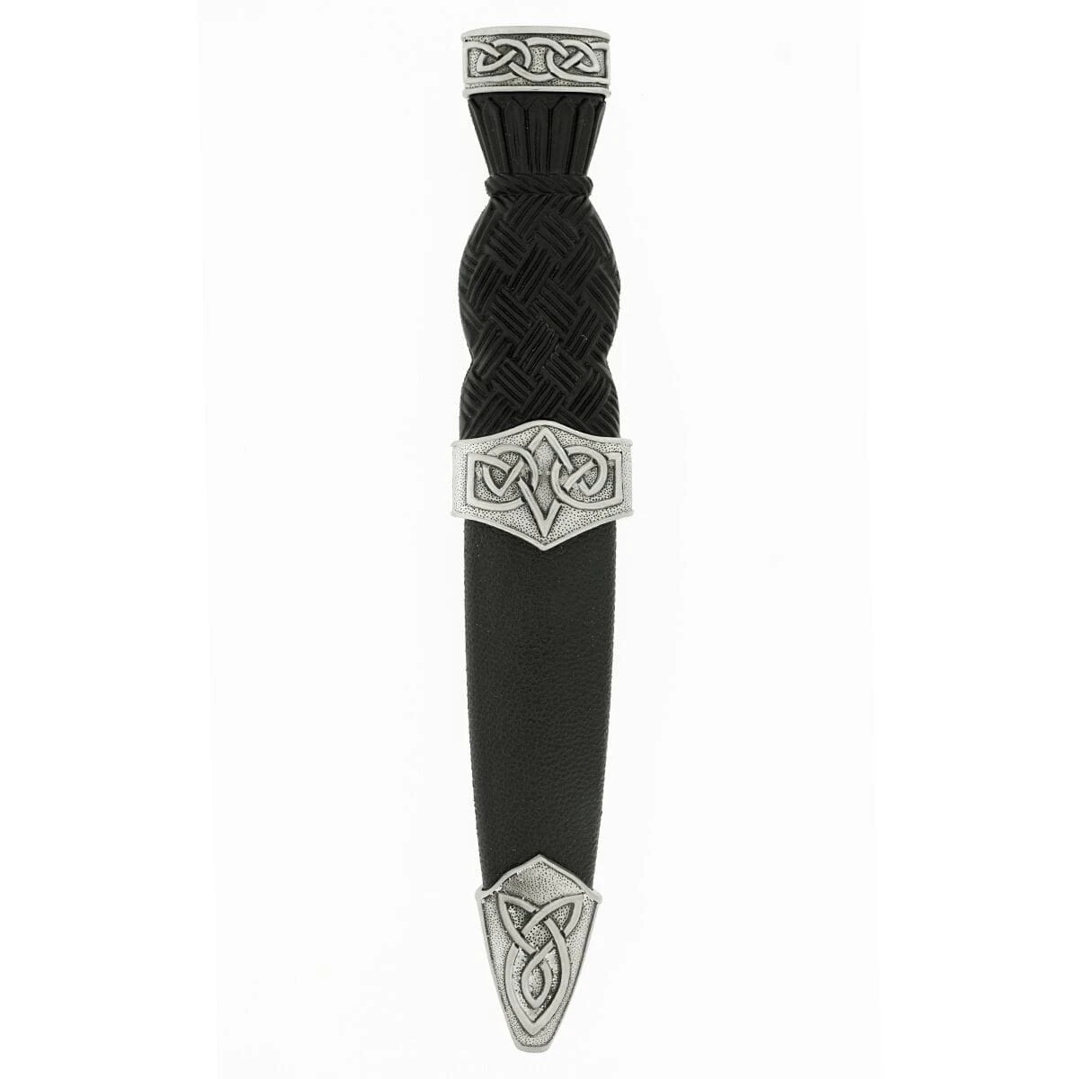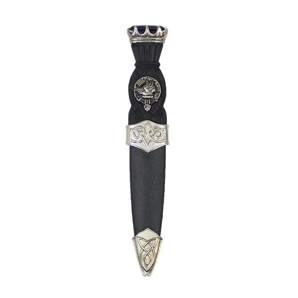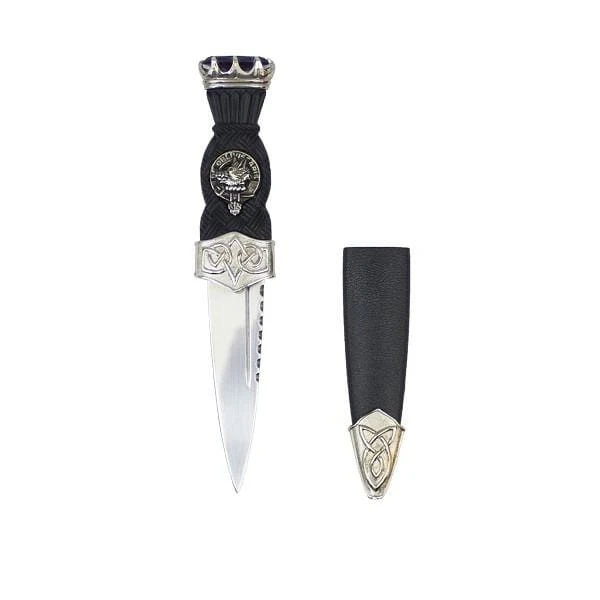 This black Sgian Dubh features a Celtic design, and a clan crest badge positioned in the centre of the handle.