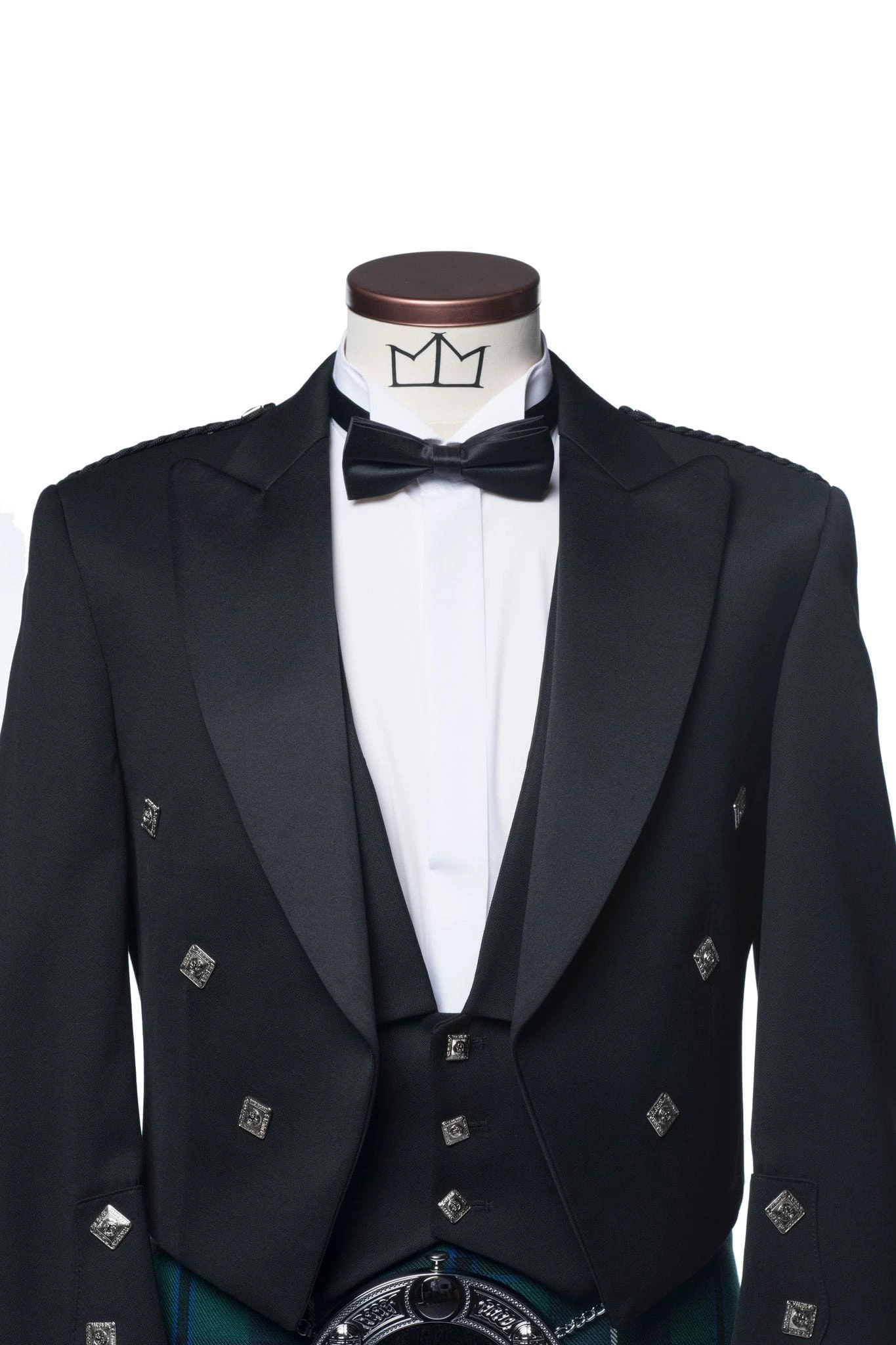 The Prince Charlie jacket and 3 button waistcoat is expertly crafted from 19oz Barathea Wool. Perfect for black tie events, this classic jacket is designed with chrome buttons, crail cuffs, twisted epaulettes, a short body cut and tails at the back. The usual neckwear worn with a 3-button waistcoat is a bow tie. You can purchase one of our Prince Charlie 5-button waistcoats as a separate product if you would like to wear a straight tie or cravat tie.