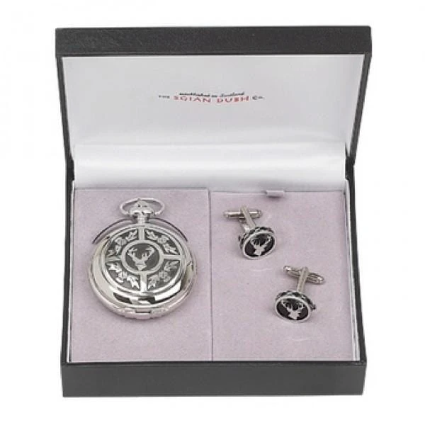 This two piece gift set has a pocket watch and cufflinks in a stag design with a polished pewter finish.